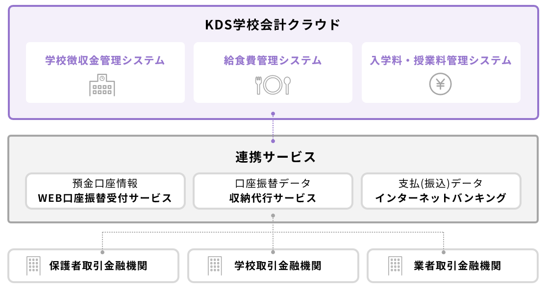 「KDS学校会計クラウド」は、学校徴収金や給食費の徴収・管理を口座振替を活用して効率的に行い、